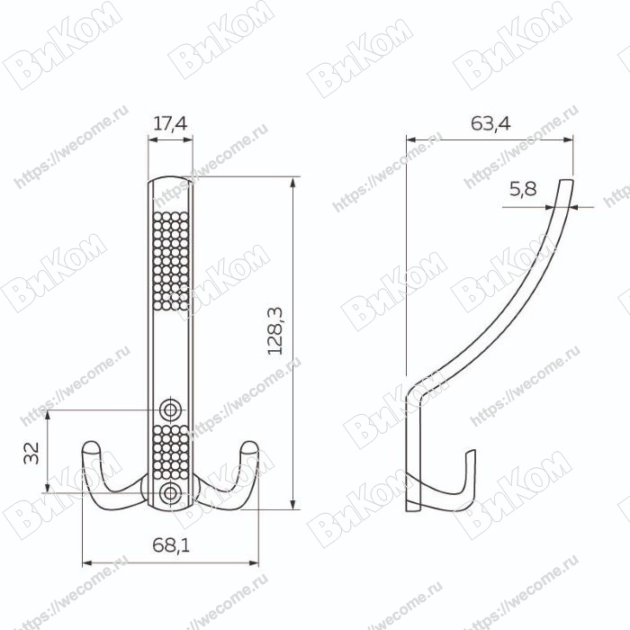 Крючок KR 0060, 2-х Рожковый Перф, Хром (30х75х58 мм) KERRON (60*)