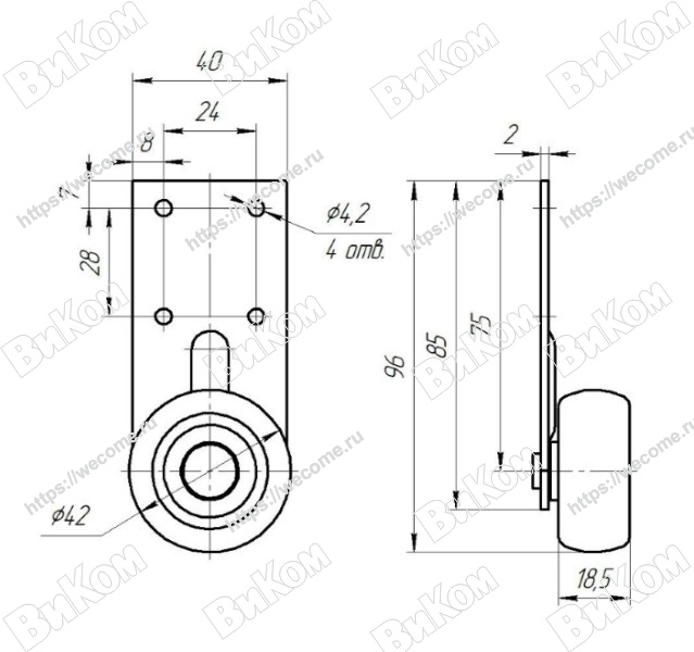 Ролик консольный D=42 мм с плоским кронштейном, обрезиненный (200*) Иж